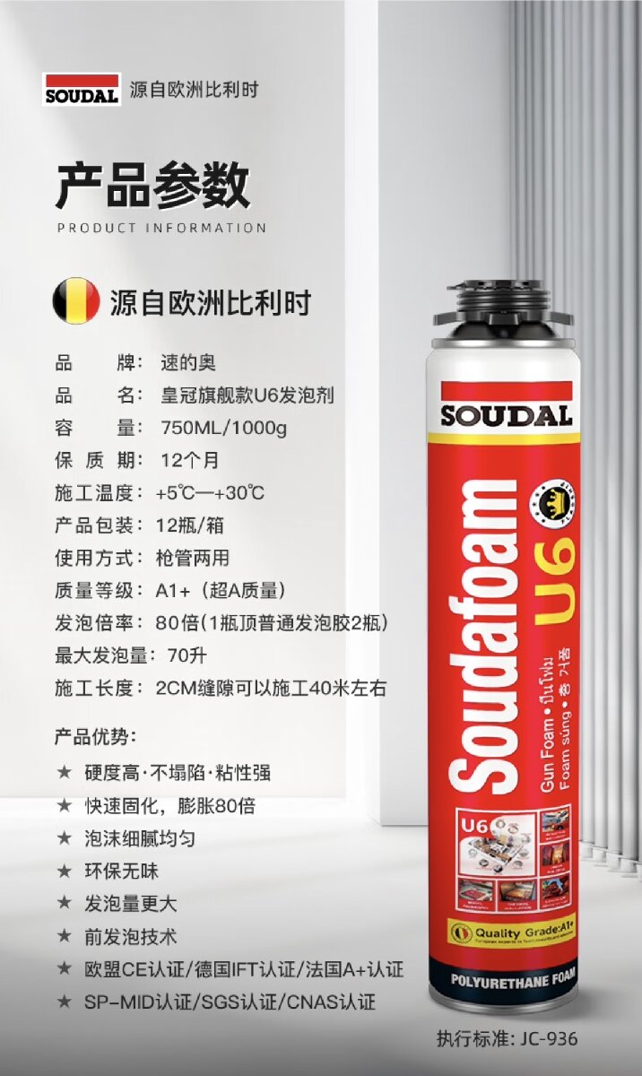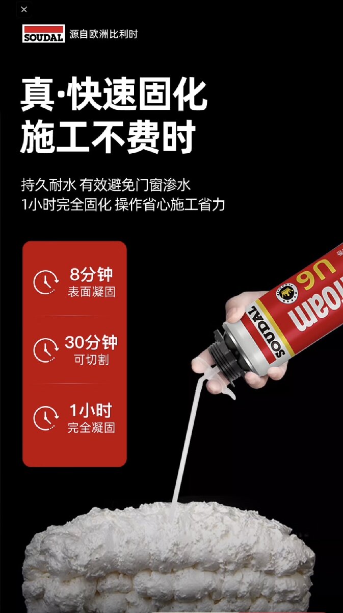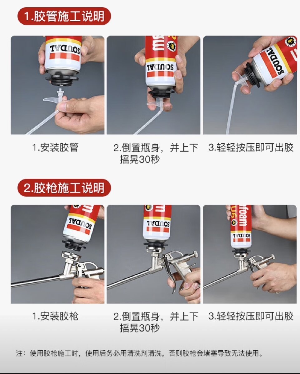 [使用说明]:若室内施工,呐通风状况良佩戴手套和护目镜,注意施工前后请勿吸烟;除去施工表面浮沉、并在施工面喷少许水使用前用力摇晃罐子30秒;将罐子安装于胶枪!施工过程多次摇晃子;若喷酒,未固化的发泡剂可用清洗剂或丙酮马上处理固化后的只能铲或者用去除剂处理。