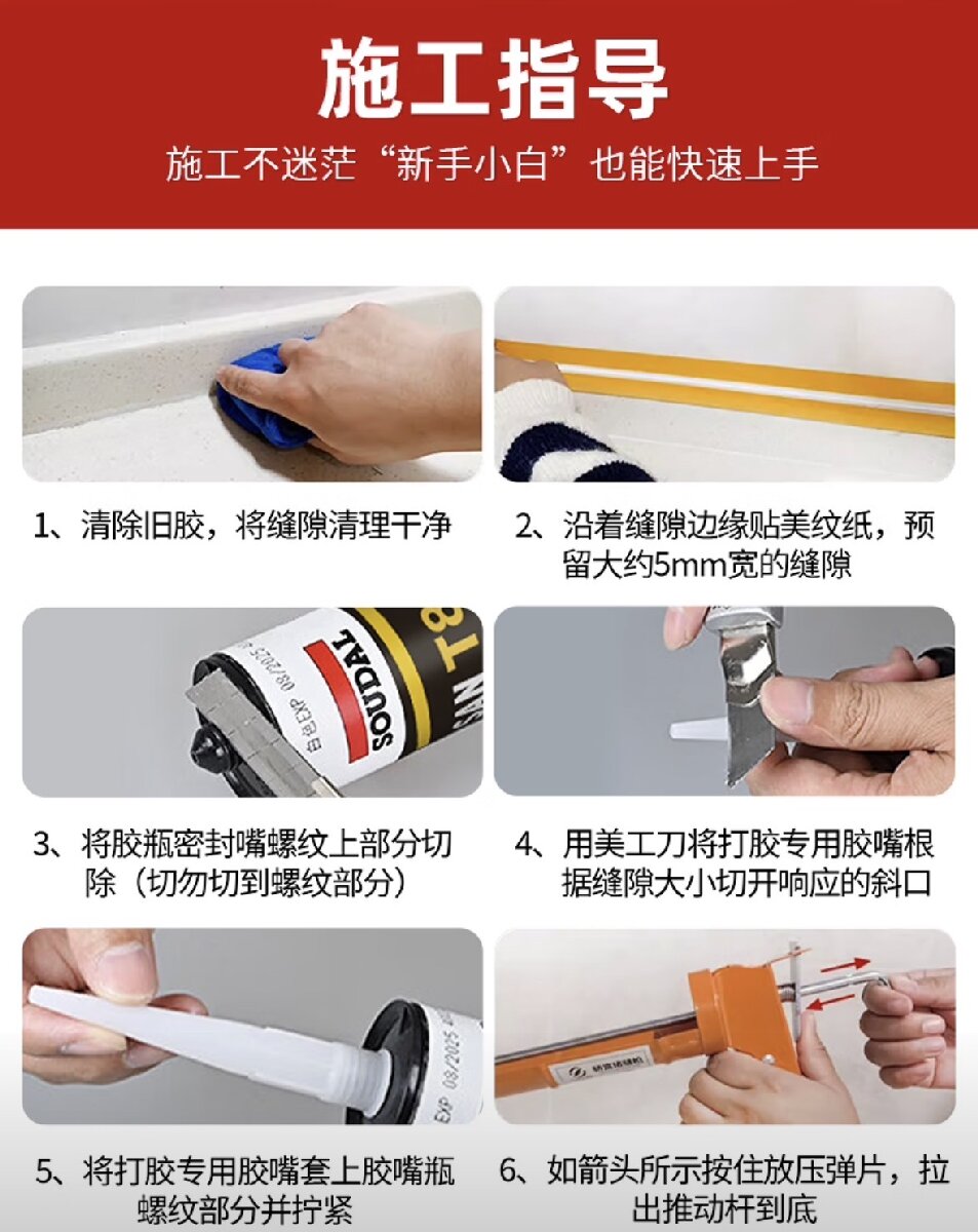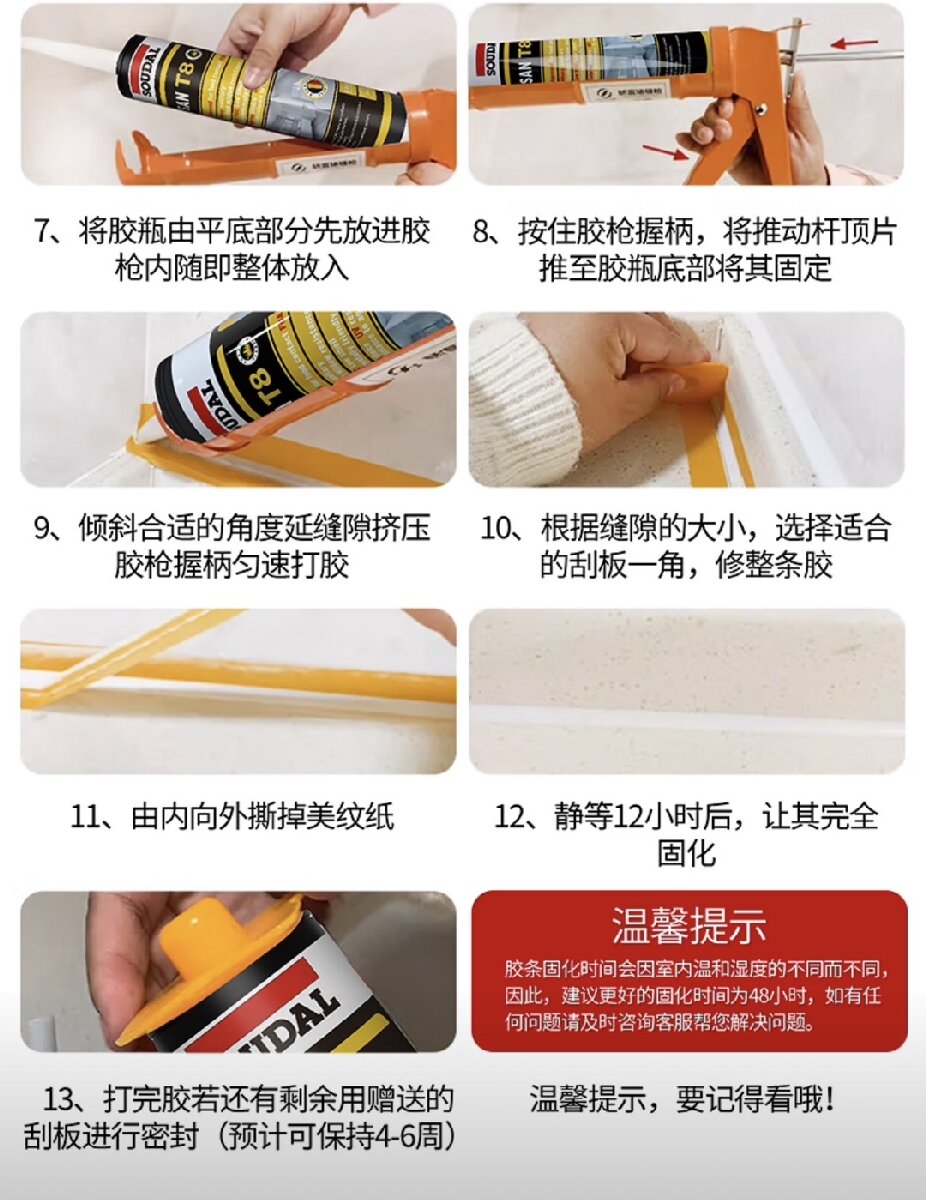 卫生间(浴缸、马桶、台盆等)和厨房接缝密封;全屋室内外美容收边密封填缝;冷库和集装箱的密封;其他密封需求。使用说明: